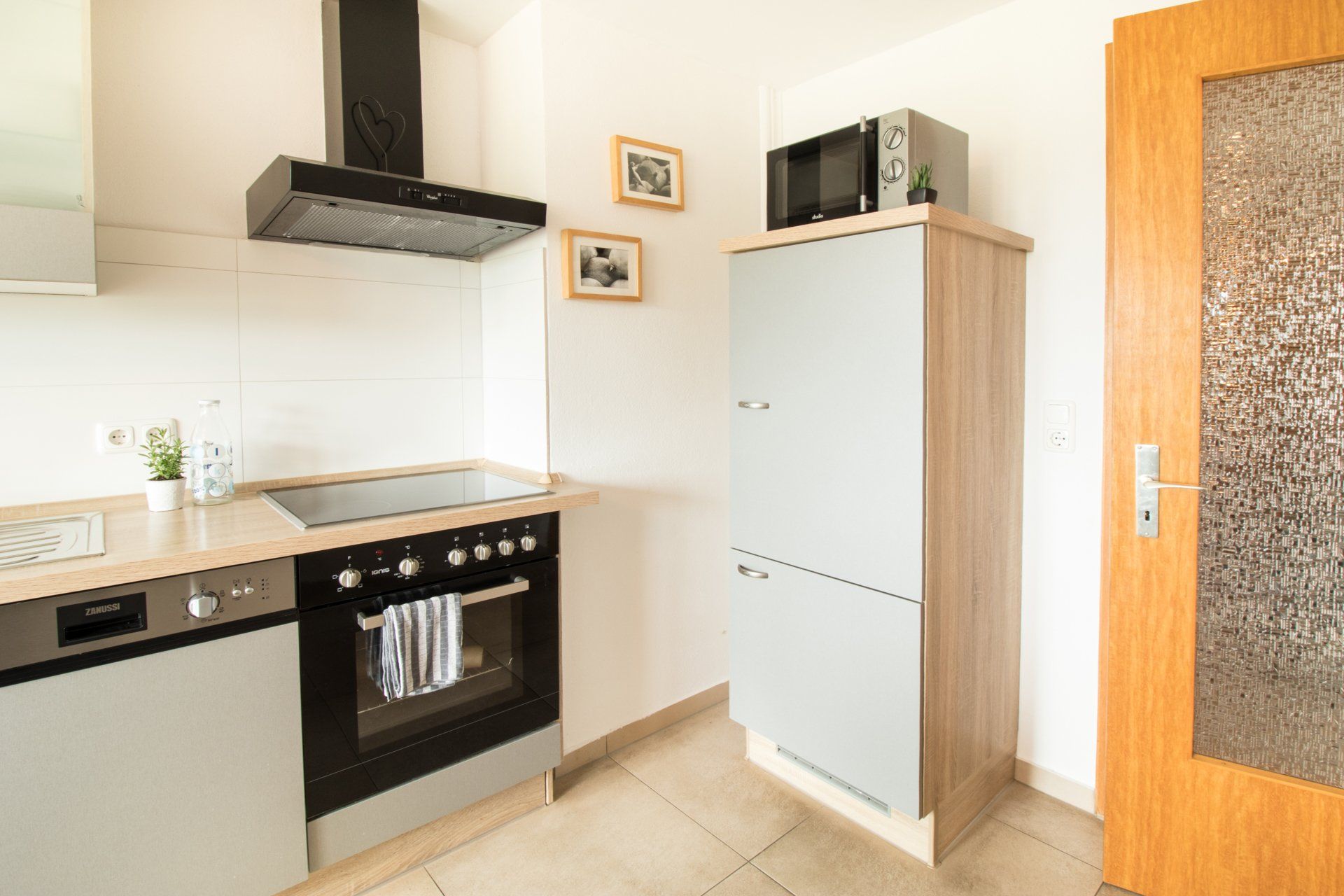 - Küche, komplett ausgestattet mit E-Herd, Backofen, Kühlschrank, Mikrowelle, Geschirrspüler, Kaffeemaschine, Wasserkocher, Handrührgerät und Toaster