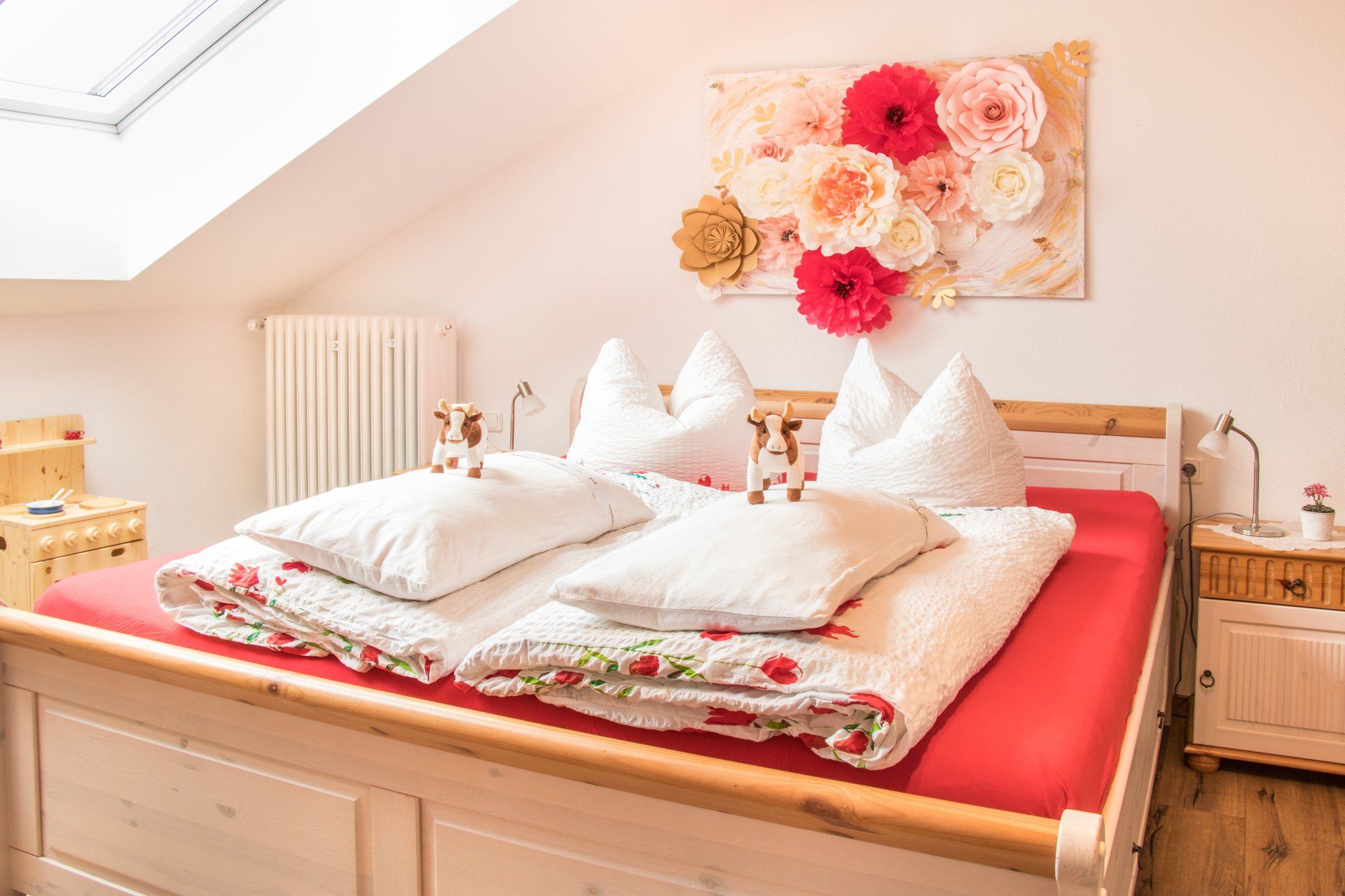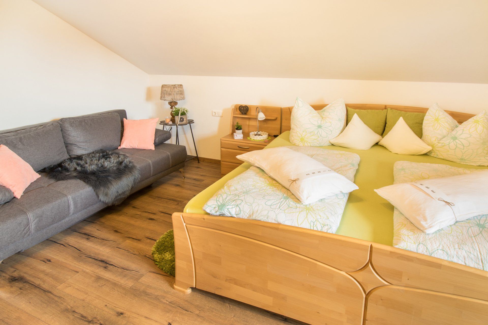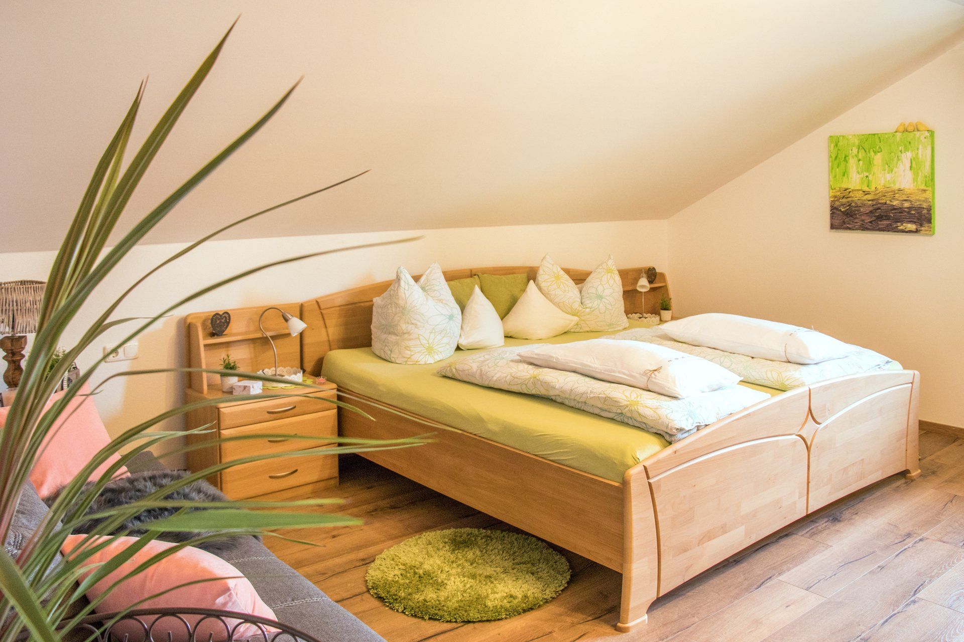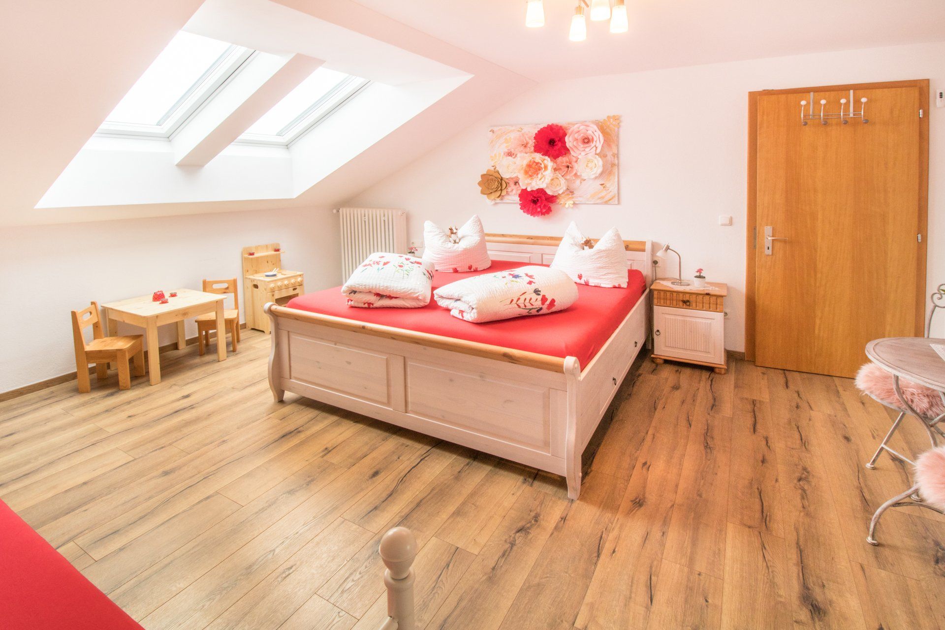 Die helle und geräumige Ferienwohnung befindet sich im Bauernhaus, verfügt über einen Balkon mit einem weitläufigen Blick auf die Ratzinger Höhe und die Umgebung des Hofes.