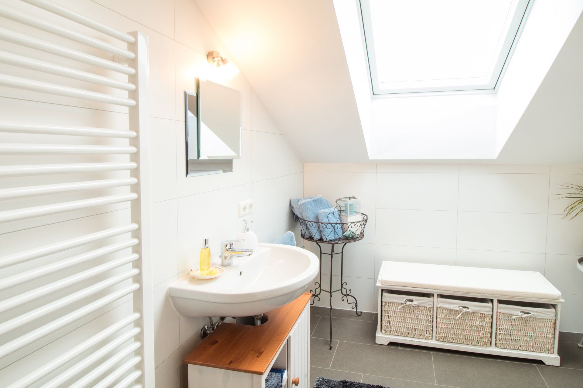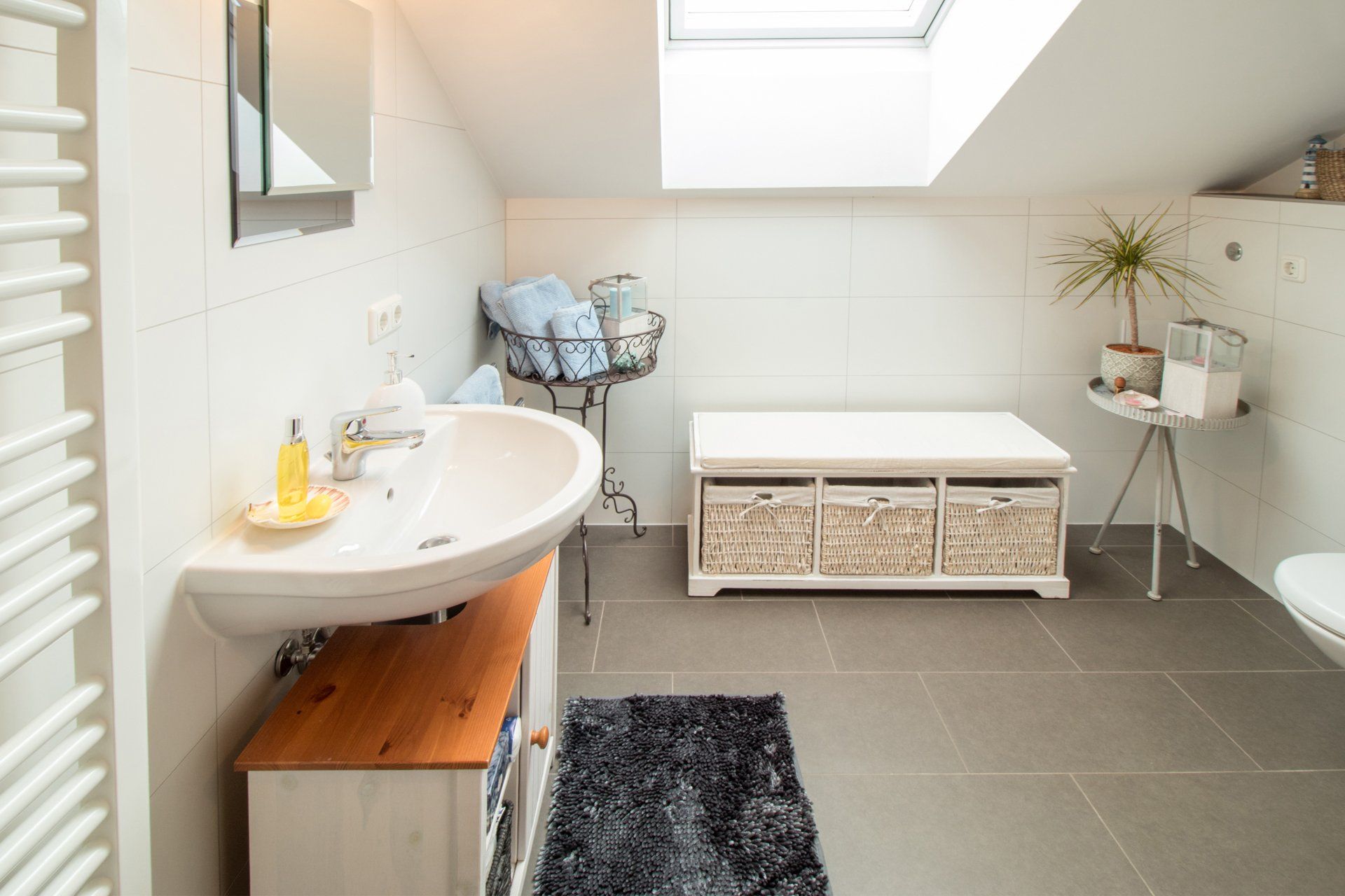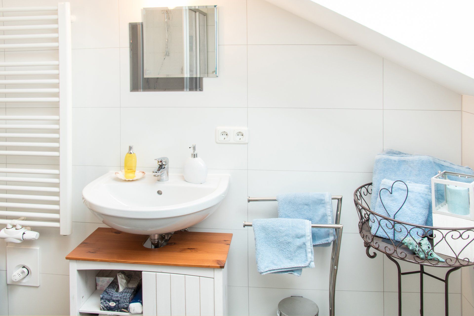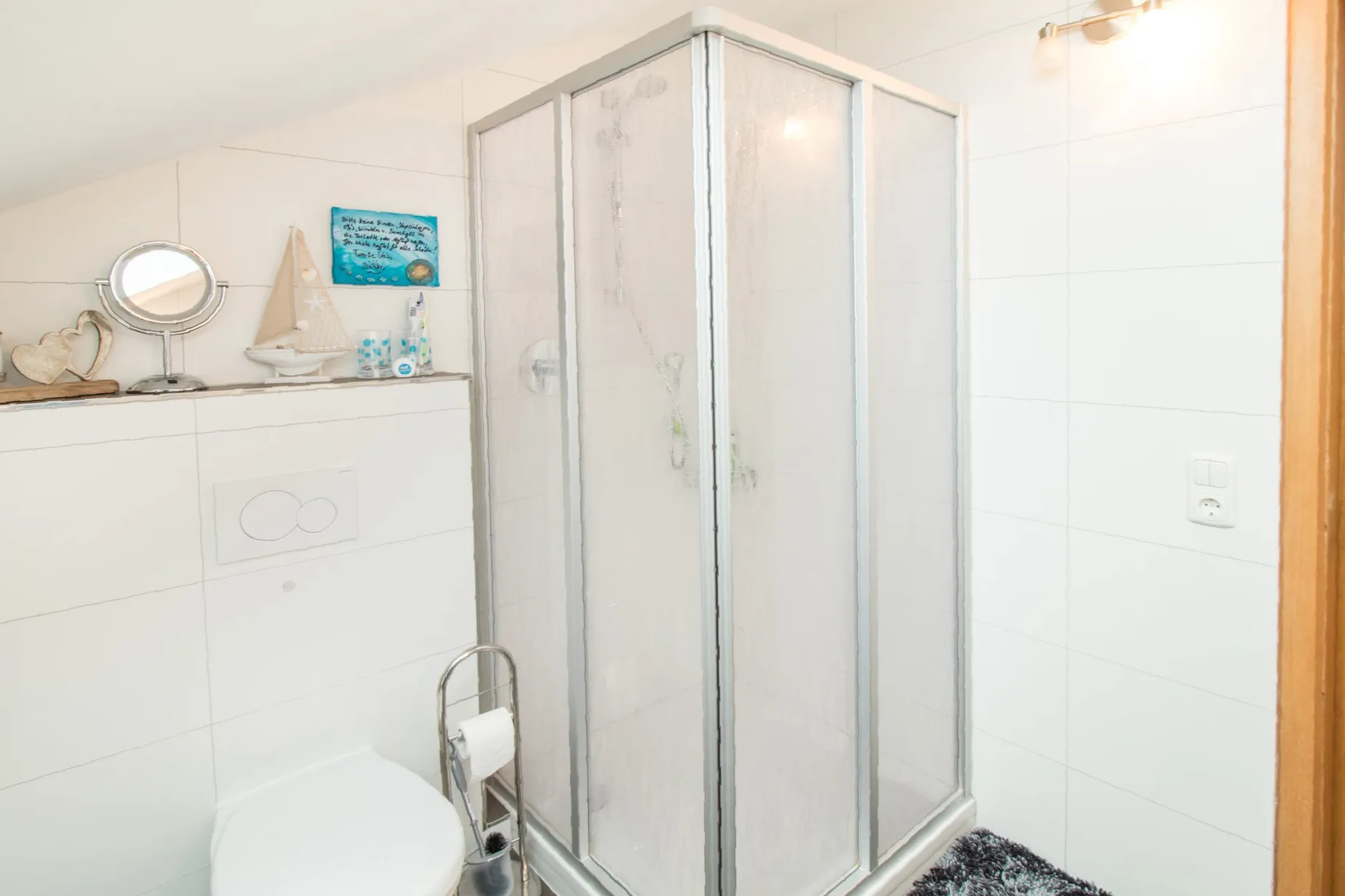 - 1 Badezimmer mit Dusche, WC, Handtuchtrockner, Fön, Kosmetikspiegel