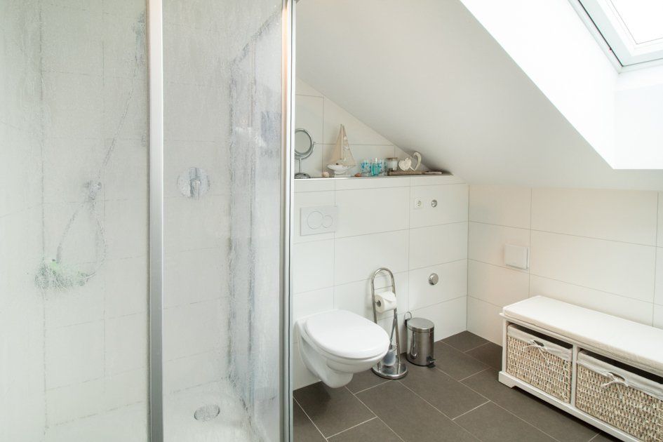 - 1 Badezimmer mit Dusche, WC, Handtuchtrockner, Fön, Kosmetikspiegel