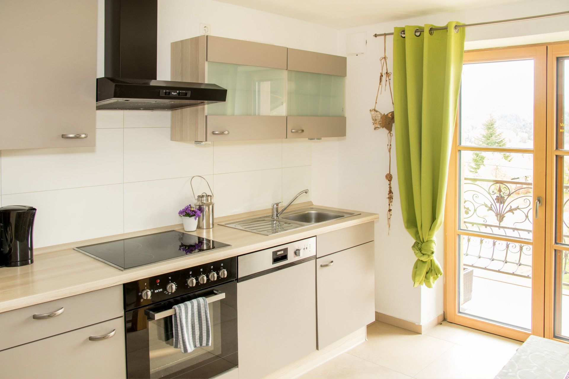 - Küche, komplett ausgestattet mit E-Herd, Backofen, Kühlschrank, Mikrowelle, Geschirrspüler, Kaffeemaschine, Wasserkocher, Handrührgerät und Toaster