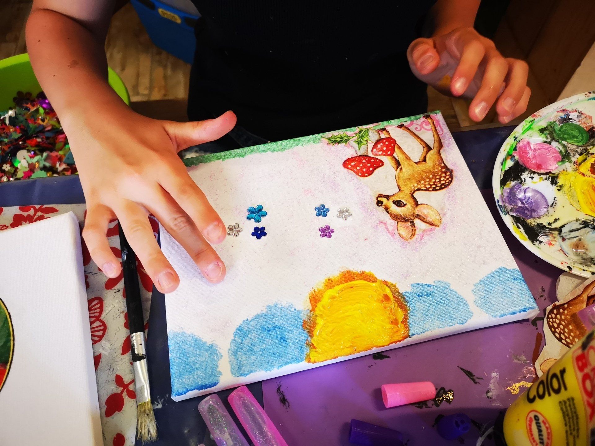 Beim kreativen Malen beschäftigen wir uns z. B. mit dem Erstellen von Bildern auf Leinwand aber auch mit dem Bemalen von Keramik oder Steinen und dem Malen mit Sand (Sandbilder gestalten). Wir erstellen Collagen mit Mix Media Technik und lernen unterschiedliches Material zu verwenden und toll zu gestalten. Beim "Kreativen Malen für Kinder" geht es vorrangig um das Malen und Gestalten mit Farben oder Sand und das Erstellen von Bildern auf und mit unterschiedlichen Materialien. Welches Material und Thema bei den Kursen zum Einsatz kommt ist nicht festgelegt und wird von Bäuerin Sybille als Überraschung bekannt gegeben.