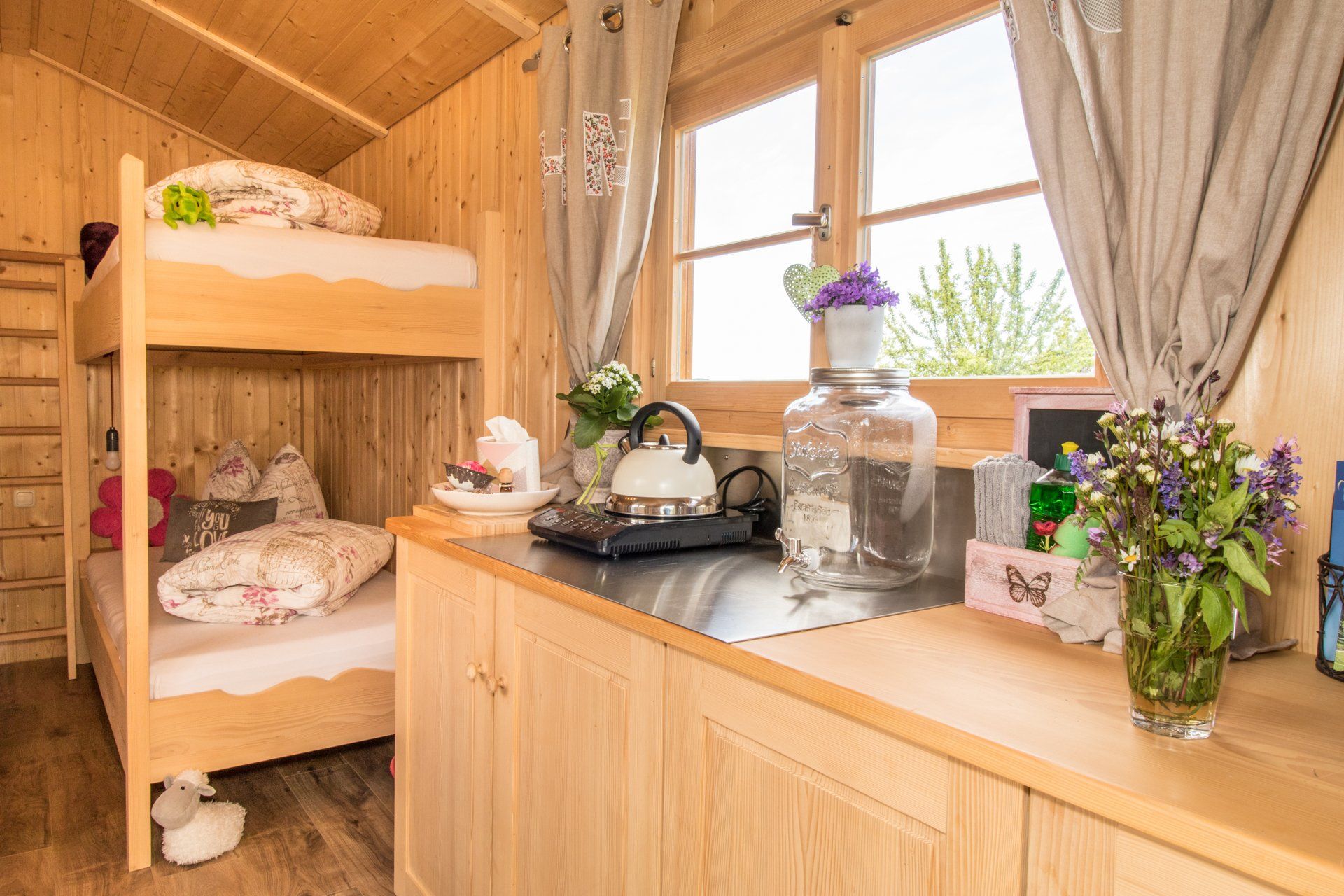 Unser gemütliches und wunderbar geräumiges Schäferwagen-Häusle "Tanne" bietet mit einer Größe von 10 m² Platz für eine ganze Familie. Hell und urig bietet es neben einer praktischen Küchenzeile noch genügend Platz für einen Tisch mit Bänken.