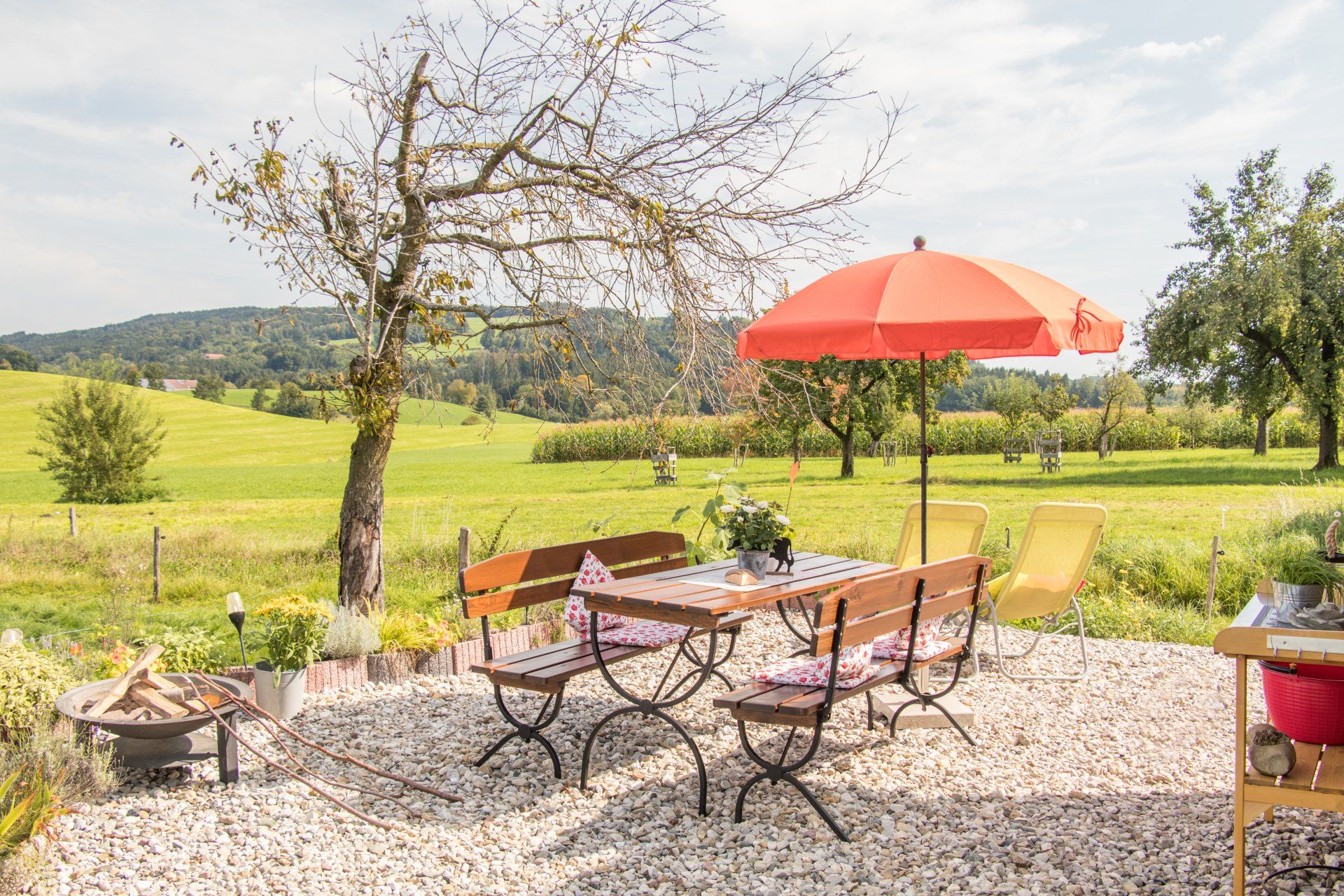 Auf Ihrer Veranda stehen Ihnen zwei Sonnenliegen, ein Sonnenschirm und eine Sitzgruppe für vier Personen zur Verfügung. Dazu gibt es eine herrliche Aussicht die Sie genießen können.
